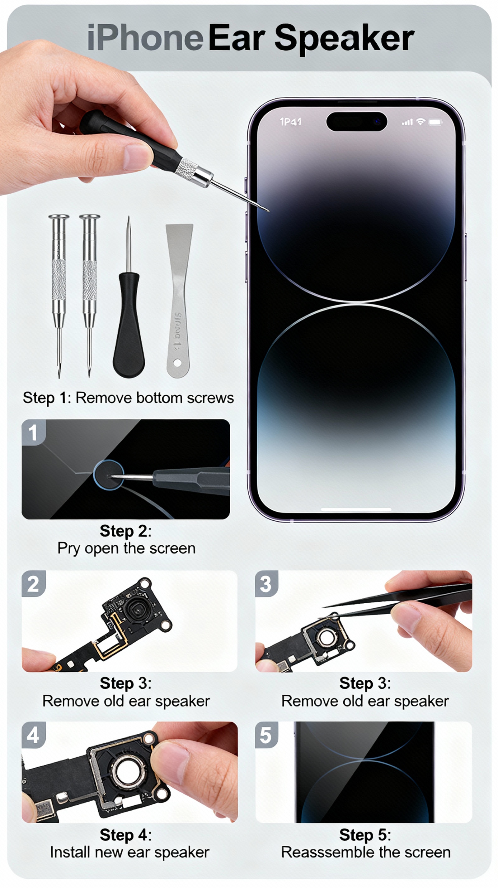 ৪. নতুন ইয়ার স্পীকার সংযুক্ত: আসল পার্টস দিয়ে নতুন স্পীকার প্রতিস্থাপন করা হয়।