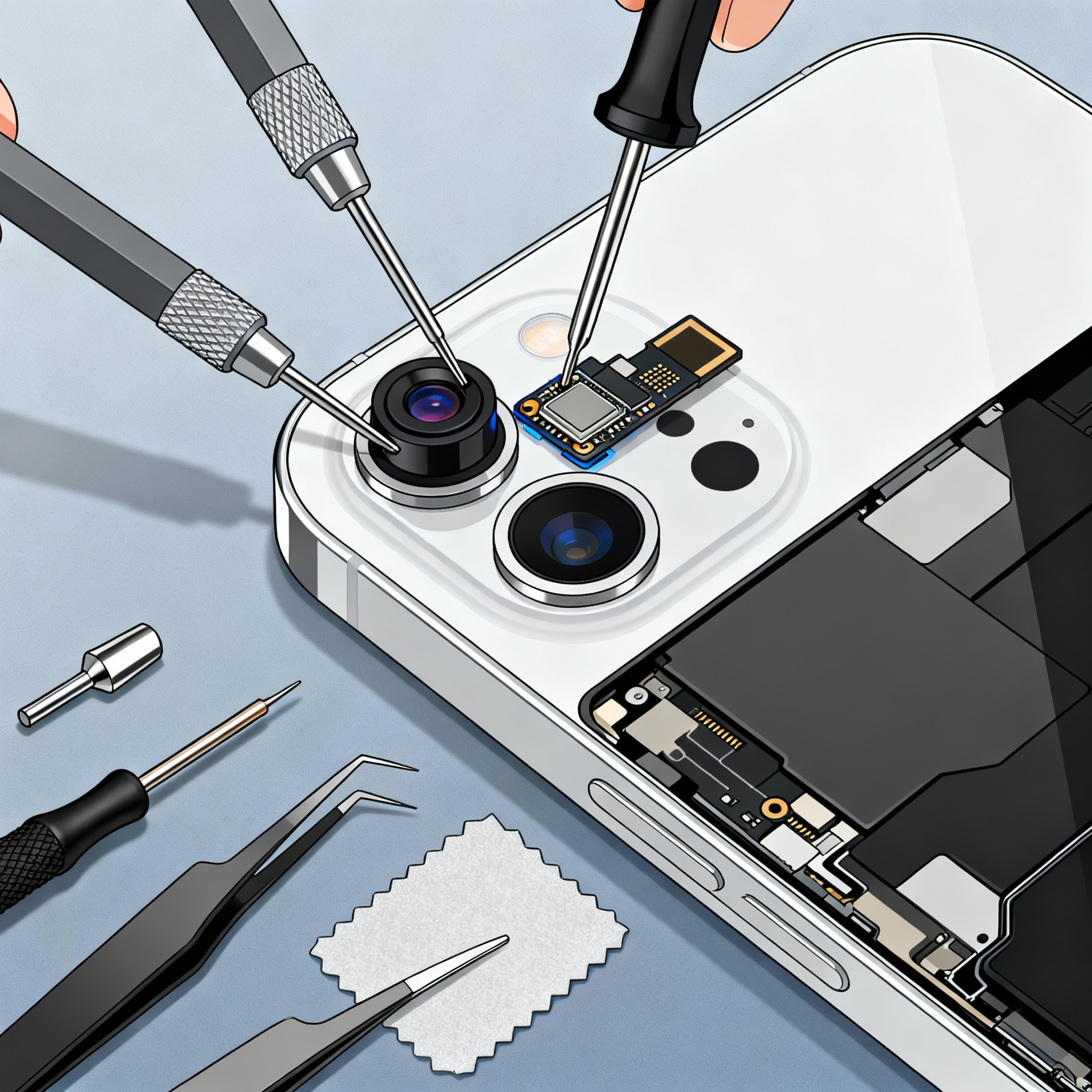- নিরাপদ ডিভাইস ওপেনিং: বিশেষ টুলস দিয়ে ফোন দারুনভাবে খুলে ফ্রন্ট ক্যামেরা প্যানেল আলাদা করা হয়।