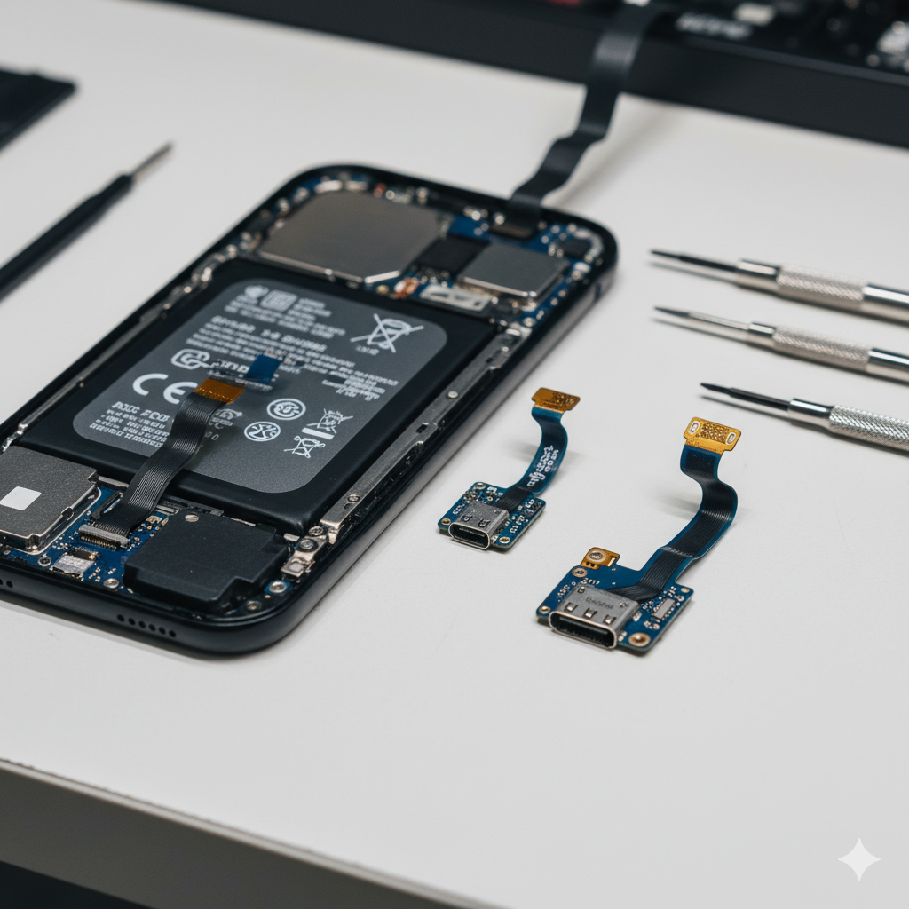 - Disassembly: স্ক্রিনের গ্লাস অত্যন্ত সাবধানে খুলে ফোনের নিচের অংশে থাকা চার্জিং ডক অ্যাক্সেস করা হয়।