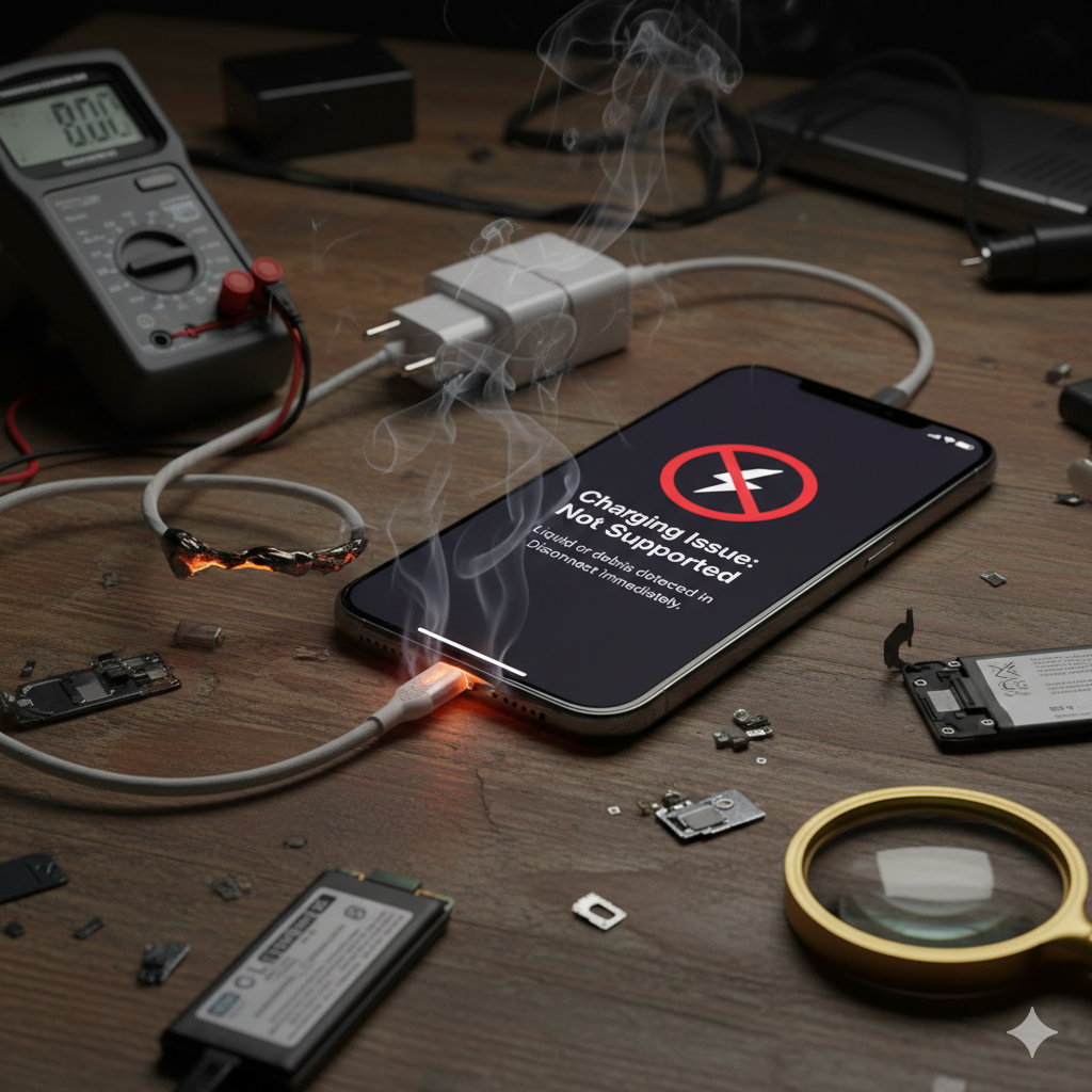 রিপেয়ার প্রক্রিয়া স্টেপ-বাই-স্টেপ: ১. ডায়াগনস্টিক – কেবল/অ্যাডাপ্টার টেস্ট, পোর্ট রেজিস্ট্যান্স মাপ, 3uTools স্ক্যান। ২. সফট ফিক্স – ফোর্স রিস্টার্ট (ভলিউম+সাইড), সেটিংস > ব্যাটারি > Optimized Charging অফ। ৩. হার্ডওয়্যার – পোর্ট ক্লিন (IPA স্প্রে), ফ্লেক্স চেক, U9500/U9720/U4000 IC রিহট/রিপ্লেস (২৫০০-৮০০০ টাকা)। ৪. টেস্টিং – ৩০ মিনিট ২০W চার্জ, MagSafe চেক, ভোল্টেজ ৩.৫V কনফার্ম। ৫. হ্যান্ডওভার। সময় ৩০-৯০ মিনিট, সাকসেস ৯৭%। ঢাকার Eastern Plaza/Jamuna Future Park-এ কুরিয়ার সুবিধা।