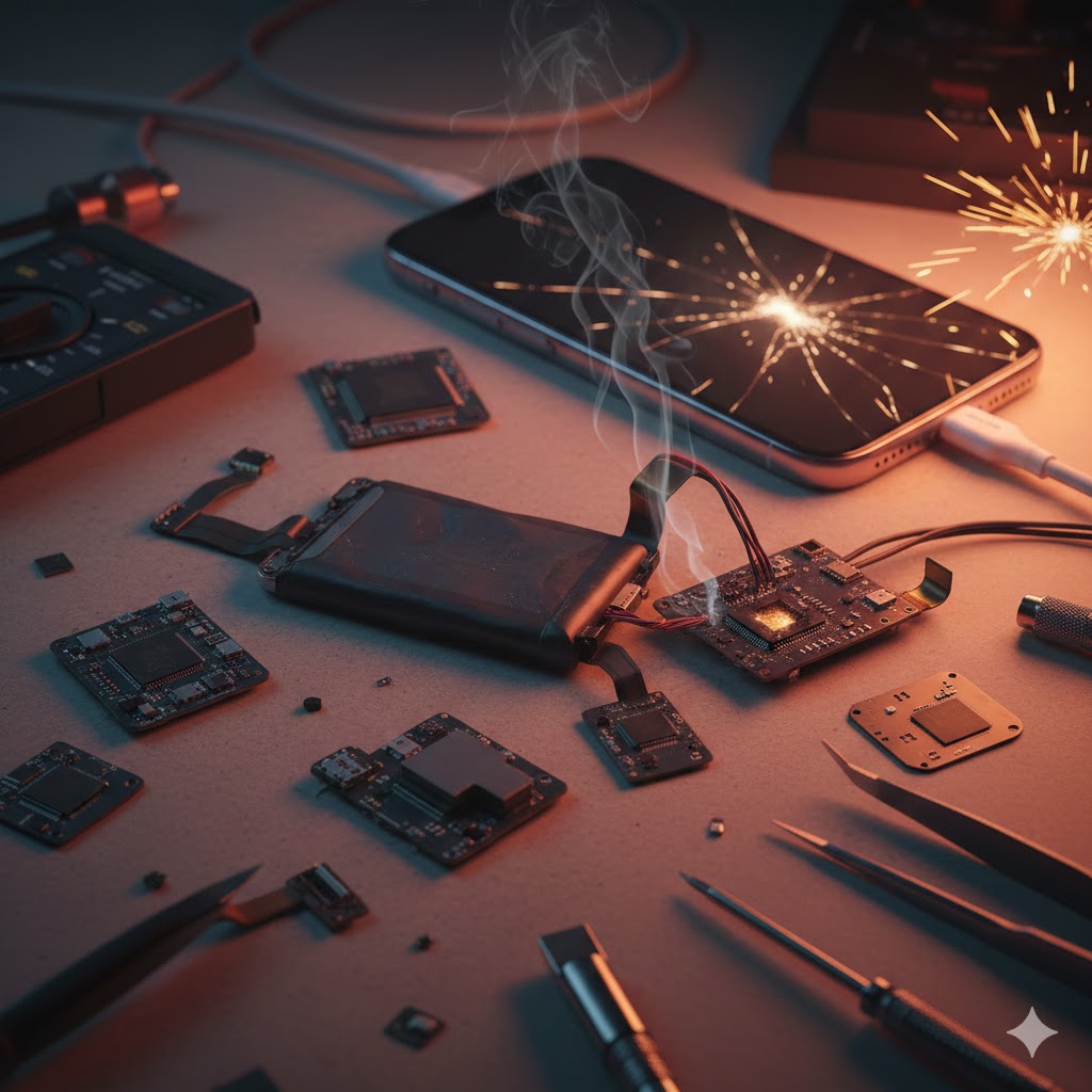 Power system‑এ মূলত কয়েকটি গুরুত্বপূর্ণ অংশ থাকে — Battery, PMIC (Power Management IC), Charger IC এবং বোর্ড‑level লাইন ট্রেসিং। এই উপাদানগুলোর যেকোনোটি ক্ষতিগ্রস্ত হলে পুরো ফোন অন হবে না।